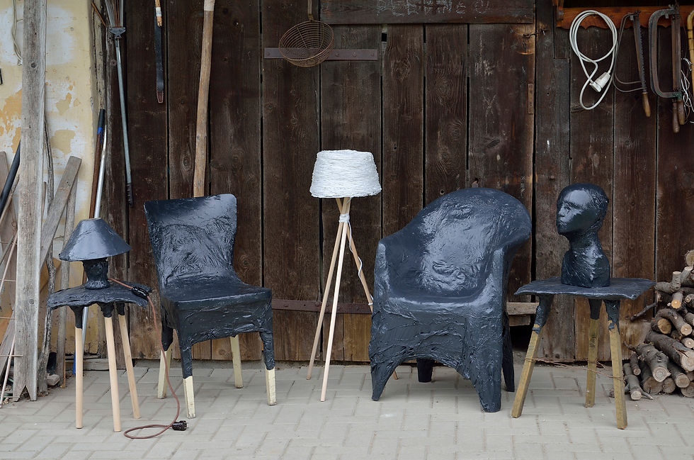 Kolekciu stolíkov, stoličky, kresla, stolnej lampy a busty som vyrobila z plastových odpadových vriec a stojace svietidlo z plastového špagátu pomocou jednoduchého recyklačného procesu. V rámci recyklačného procesu som opätovne použila staré, vyradené kusy nábytku alebo jeho časti, ktoré som balila do odpadových vriec, špagát som ne navíjala. Plastové vrecia a špagát som potom tavila teplovzdušnou pištoľou, čím vznikli náhodne roztavené plochy plastu.